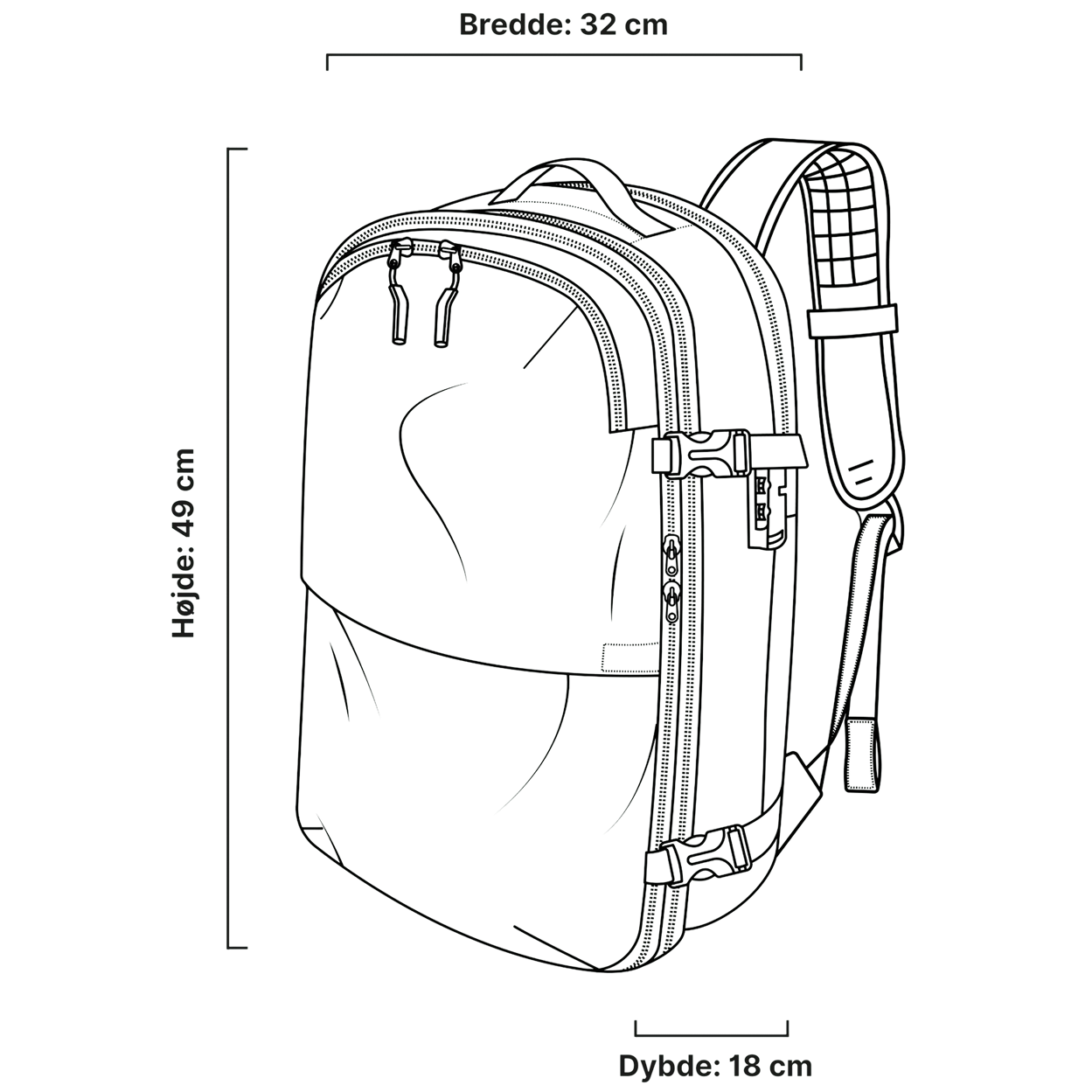 Dimensioner: 49 cm x 32 cm x 18 cm (svarer til standard carry-on størrelse)